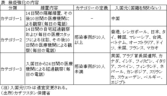 カザフスタン政府は新型コロナウイルス肺炎対策のため、入国時の検疫態勢を強化する。カザフスタン保健省は2月17日、物品・サービス品質安全管理委員会主任検疫官決定第5号「コロナウイルス感染予防の強化対策について」を出し、2月20日から新型コロナウイルスの感染が確認された国・地域からの入国者を3つのカテゴリーに分類し、経過観察を行うことを決定した(表参照)。決定第5号はカザフスタン保健省ウェブサイト