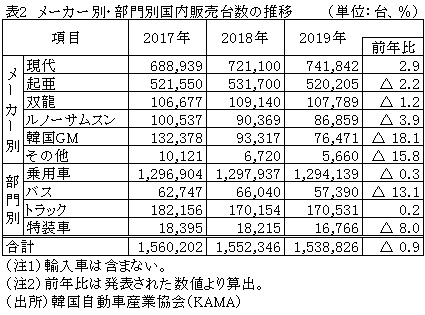 韓国自動車産業協会(KAMA)が発表した自動車産業統計によると、2019年の国内生産台数は前年比1.9%減、国内販売台数(輸入車を除く)は0.9%減、輸出台数は2.0%減、海外生産台数は4.3%減となった。韓国の産業通商資源部は国内生産について、ルノーサムスンの受託生産の減少、韓国GM(ゼネラルモーターズ)のストライキによる生産停滞、国内生産ラインの調整などにより、1.9%減の395万614台だったと分析した(表1参照)。