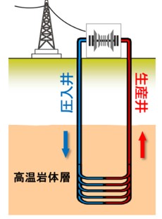 (注)地下から熱水や蒸気を直接的に取り出して発電を行う従来型地熱発電と異なり、図のように、地下の高温岩体層に圧入井と生産井からなる閉囲型の井戸を形成し、地上から水などを循環させることで、地下の熱のみを回収して発電を行う方式。熱水や蒸気を直接的に採取しないため、環境負荷を軽減できるメリットもある。