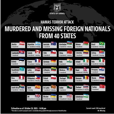 イスラエル首相府報道局は10月25日、ハマスとの軍事衝突によって死亡、または行方不明となっている外国人の国籍別内訳を明らかにした。