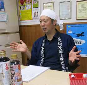 海外展開を進めるにあたっては、既に進出しているメーカーも多いことから、自社製品の特徴と差別化ポイントを明確に打ち出すことをジェトロ専門家からアドバイスを受けました。弊社の醤油は丸大豆・小麦、食塩のみを原料とし、化学調味料は使っていません。製法も、ほとんどのメーカーがステンレスのタンクを用いる中で、伝統的な杉桶仕込みを採用しています。発酵熟成は一般の大量生産品が半年であるのに比べ、1~2年掛けて熟成させており、醤油本来のコクがあり、香り豊かなのが特徴です。こうした点をPRすることにより、海外展示会でも高い評価を得ており、輸出した7カ国・地域のディストリビューターからはリピートオーダーも獲得しています。再仕込生醤油のほか、減塩醤油、ぽんず醤油ゆず、だしの素が海外での売れ筋となっています。さらに特徴を出すために、海外向け新商品としてスイーツに掛ける醤油を投入し、ハラール対応可能な粉末醤油も開発中で、今後も海外向け品揃えを増やしていく計画です。