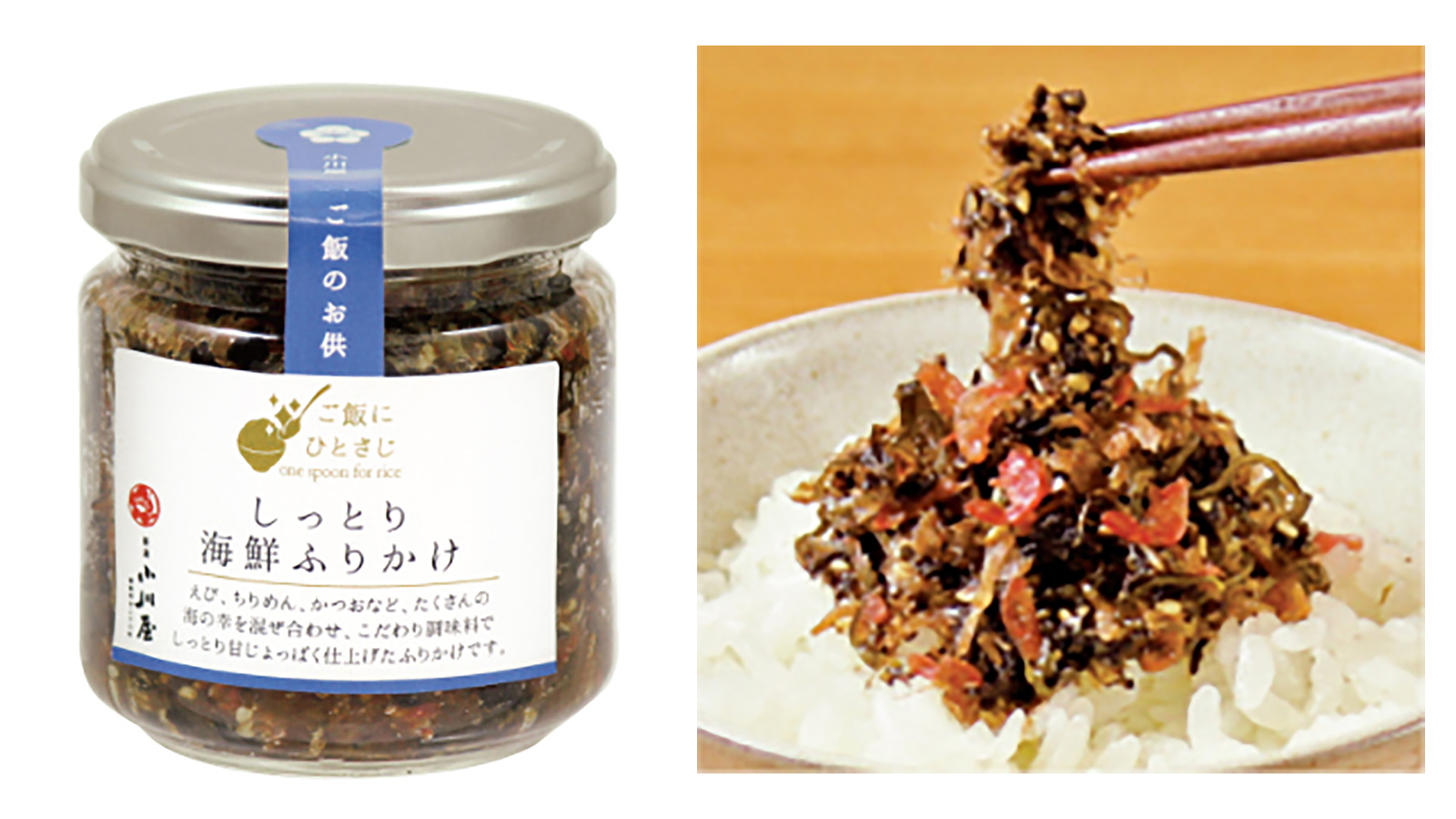 Shrimp, dried sardines, bonito, and many other seafood are mixed together, and seasonings are used to create a moist, sweetand salty furikake. It is also recommended for rice balls, as it goes well with white rice.