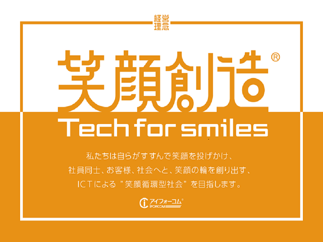 The company name “iFORCOM” is a coined word that combines the three words “identity”, “FOResight”, and “COMmunication”. The idea is to provide unique foresight services while valuing communication with society. We aim to create a “smile-recycling society” through ICT that creates smiles for employees, customers, and society. We are now actively engaged in AI and IoT R & D. In addition, we are challenging to create social change mechanisms in all fields, such as the environment, medical care, and education. As a career step after joining the company, there will be careers in Indonesia and other ASEAN branches, so let's aim for a “smile-recycling society” together.