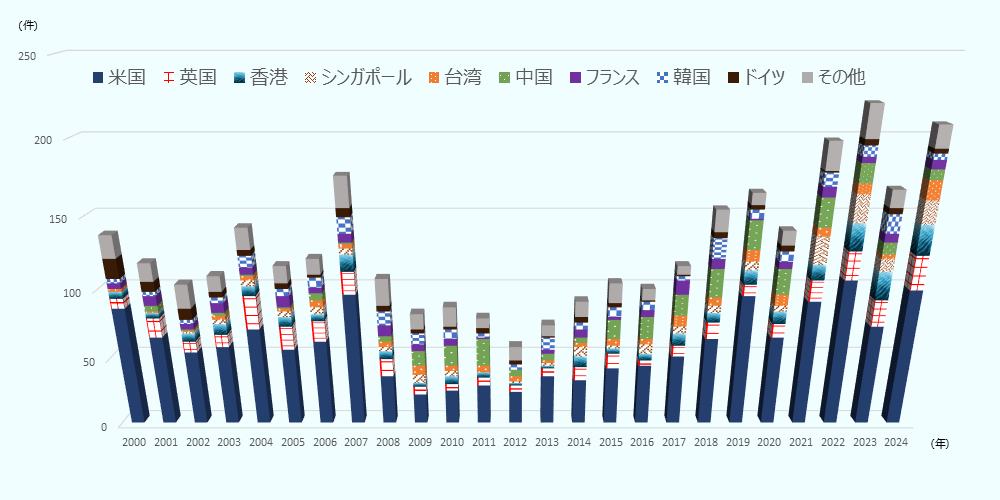 2024年の対日クロスボーダーM&Aは、前年比24.6%増の208件に達し、2023年の落ち込みから回復した(図表2‑18)。円安による日本企業・資産の割安感、コーポレートガバナンス改革などによるM&A環境の整備、海外プライベートエクイティファンドの資金流入などにより、押し上げられたとみられる。投資元国・地域を見ると、米国が99件(構成比47.6%)と最多で、英国24件(同11.5%)、香港21件(同10.1%)と続く(図表2‑19)。シンガポールが9件から16件、台湾が3件から13件と大きく伸ばしたのに対し、韓国は13件から4件と減少した。