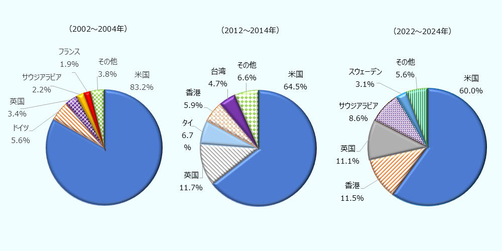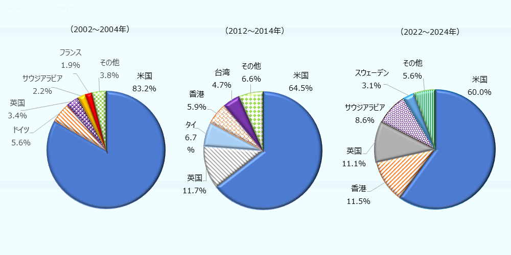 2022~2024年の3年間の対日クロスボーダーM&A投資金額の合計は約7.4兆円で、米国・香港・英国の上位3カ国が約6.1兆円(構成比82.6%)を占めた(図表2-20)。10年単位で、連続する3年間の推移をみると、 2002~2004年は約2.2兆円で、このうち米国が1.8兆円(同83.2%)と圧倒的な存在感を示していた。 2012〜2014年は約1.5兆円と、2022~2024年の2割程度にとどまった。この背景には、世界経済の低迷および欧州債務危機による国際金融市場の不透明感に加え、2011年の東日本大震災がもたらしたサプライチェーンの寸断や収益環境の不安定化により、国内外を問わず投資や買収への慎重姿勢が強まったことがある。これら20年超の期間の上位国・地域を見ると、米国の1位には変化がないが、2位以下は大きく変動している。