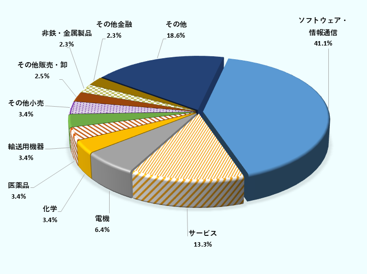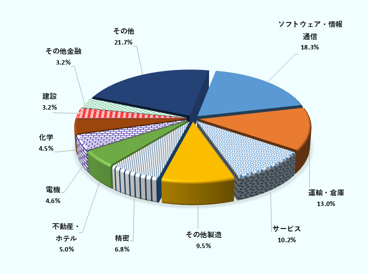 2022~2024年までの3年間の対日クロスボーダーM&Aの被買収企業を業種別に見ると、件数ではソフトウェア・情報通信が245件(構成比41.1%)で最多となり、以降サービスの79件(同13.3%)、電機の38件(同6.4%)が続いた(図表2-21) 。上位2業種はともに非製造業で、合わせて5割超を占めた。金額でも同様にソフトウェア・情報通信が最多となったが、全体に占める割合は2割弱と、件数に比して低かった(図表2-22)。他方、2位の運輸・倉庫の割合は13.0%で、件数ベースでの割合の1.2%を遥かに凌いでおり、1件当たりの投資金額が大きいことがわかる。