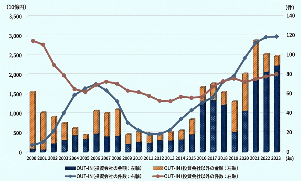 件数ベース(右軸)では、IN-IN による中小企業間のスモールM&A等、小規模案件の増加が顕著であり、取引件数全体をけん引する構造が浮かぶ。2023年時点では IN-IN の取引件数が市場全体の約8割を占めるまでに拡大したが、IN-OUT、OUT-INはほぼ横這いで、OUT-IN件数は、IN-OUTの概ね5割程度の件数で推移している。