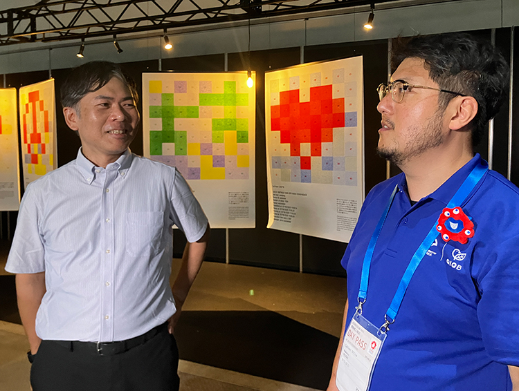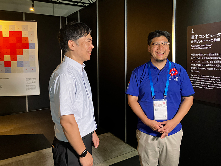 万博で展示されていた量子コンピュータアートの前で話す根来教授(右)と斎藤氏(左)