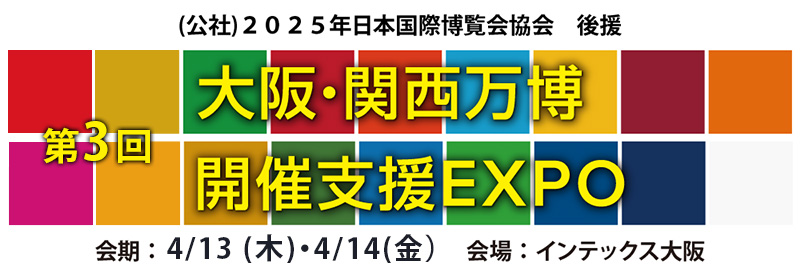 | 出展対象品目 | 大阪 関西万博に向けて、自社の技術、サービスを提供したい大阪 関西地区ならびに国内・海外の企業 設計、デザイン、内装、インテリア、セキュリティ、ヘルスケア、企画、興行、金融、決済、コンテンツ、エンタメ、アミューズメント、IT、人材、省力化など |