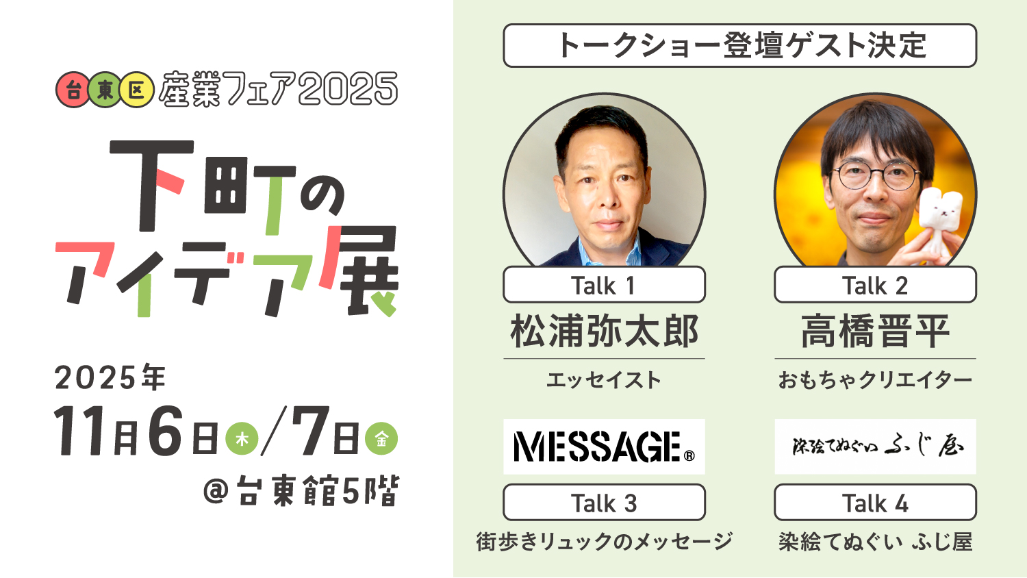 台東区産業フェア2025は、台東区の事業者がみんなでつくる見本市。出展者・バイヤー・来場者との交流から、台東区の新たな魅力に気づくチャンスが生まれます。ワクワクする商品やサービスを探しにきませんか?