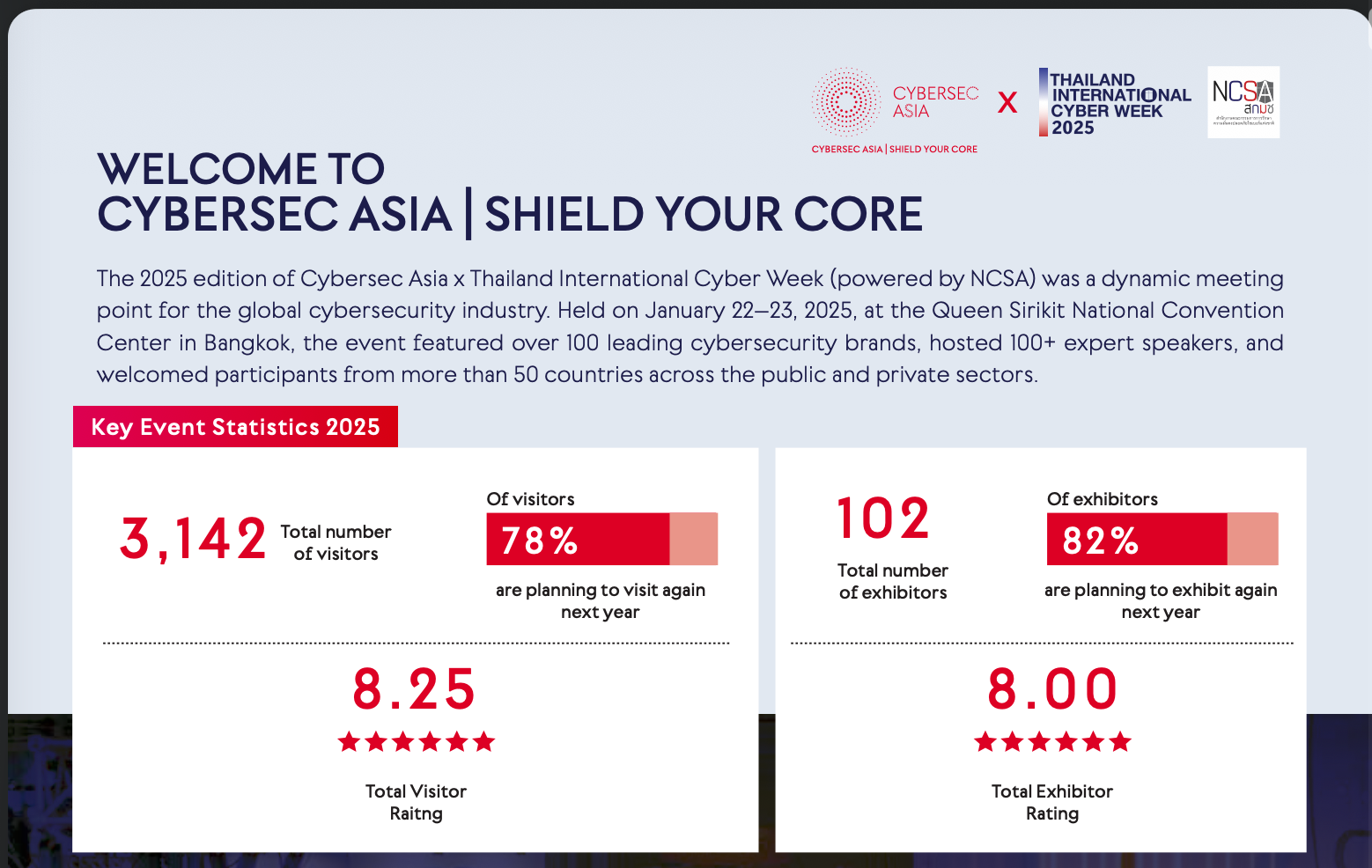 主催者より | Cybersec Asiaは、アジア太平洋地域のサイバーセキュリティ業界において、知見の共有、ソリューション展示、政府・業界の架け橋として非常に重要な役割を果たすイベントです。主なテーマは、AIインフラストラクチャ、クラウド、データ、応用AIソリューションに関する革新(innovation)で、これらを通じて、AIを活用した次の波 (next wave) を可視化/推進することを目的としています。 |