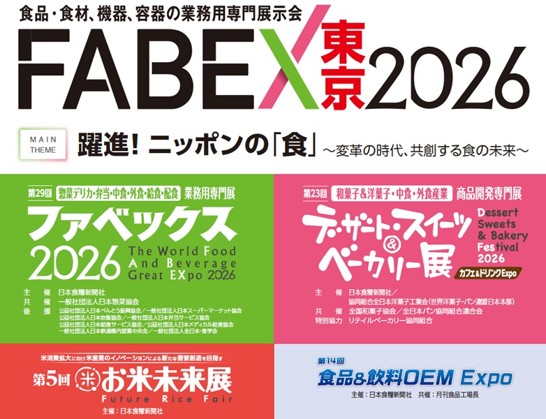 FABEX(「ファベックス」「デザート・スイーツ&ベーカリー展」「お米未来展」「食品&飲料OEM Expo」)は惣菜デリカ・弁当・中食・外食・給食業界、和菓子・洋菓子・ベーカリー・カフェ・飲料を網羅した食品・食材、機械・機器、容器・包装の業務用専門展示会です。2026年のFABEXのメインテーマは【躍進!ニッポンの「食」~変革の時代、共創する食の未来~】とし、食品産業を取り巻く環境の変化、業界の広がりを捉えた展示企画を予定しています。