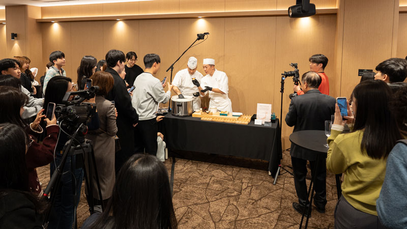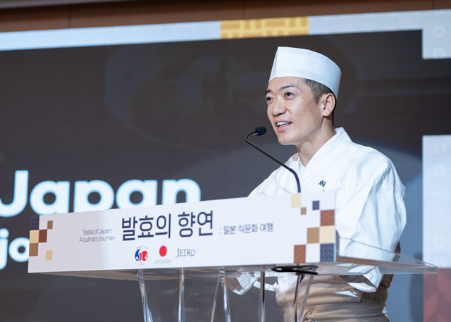 イベントでは、JFOODO執行役北川浩伸が、「韓国と日本の交流がますます活発になる中、韓国の消費者の皆さまに日本の地方食材や伝統的な発酵文化をご紹介したいと考え、本イベントを企画しました。これを機に、日本の農林水産物・食品がより身近な存在となり、観光や食文化交流がさらに深まることを期待しています」と挨拶し、著名料理人・中村浩治シェフが、西京味噌や八丁味噌など地域性豊かな発酵食品を活かし、日本産農林水産物と組み合わせた料理や韓国の食文化との融合メニューを提供しました。中村シェフは「日本の味噌、醤油、酢は韓国と同様に発酵文化の中で発展してきていますが、日本国内でも地域ごとに原料の比率や作り方、熟成の仕方が異なるため、味や色、香りに大きな違いがあります。」と各地の発酵調味料の特徴を紹介しました。