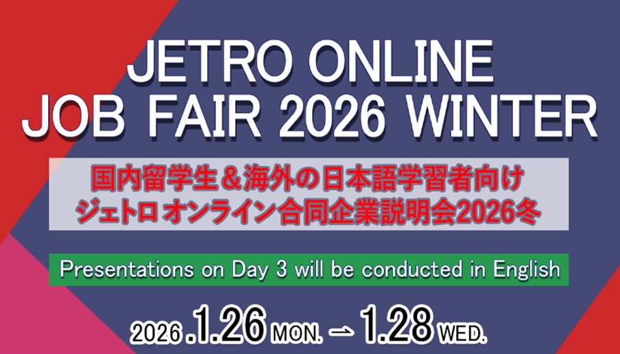ジェトロは、2026年1月26日(月曜)から28日(水曜)に、外国人留学生や海外の日本語学習者を主たる対象にした「ジェトロ オンライン合同企業説明会 2026冬」を開催します。本イベントは、海外ビジネスの拡大やイノベーション創出を目指す日本企業と優秀な外国人材の出会いの機会を提供するもので、外国人留学生向けとしては日本最大級のジョブフェアです。