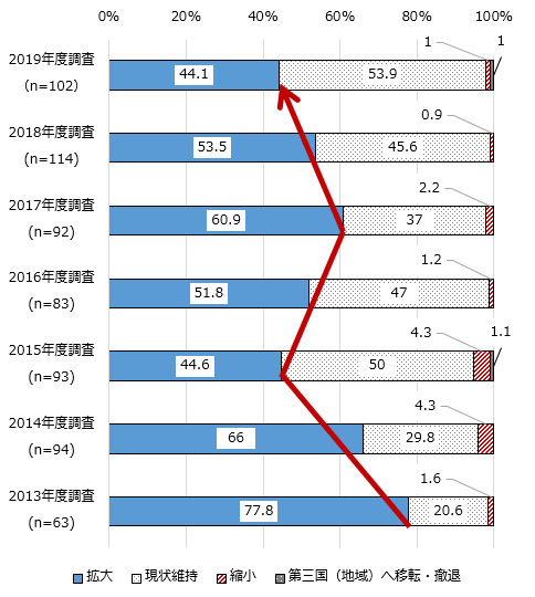 - 「拡大」と回答した企業が44.1%(9.4ポイント減)で、2年連続減少。「拡大」と回答する企業の割合の増減は、当該年の経済成長予測にリンクする傾向がみられている。「縮小」「第三国(地域)へ移転・撤退」はそれぞれ1%に過ぎず、「現状維持」が過去最大の53.9%に達し、様子見の感が強まっている。具体的に「経済・市場規模が大きく成長していないにも関わらず、競合ブランドが乱立している状況下、市場全体の成長見通しが緩やかで、積極的な投資が難しい」、「今後の欧米による対ロ制裁の行方(次第)」(ともに輸送機器部品製造)といったコメントがみられた。