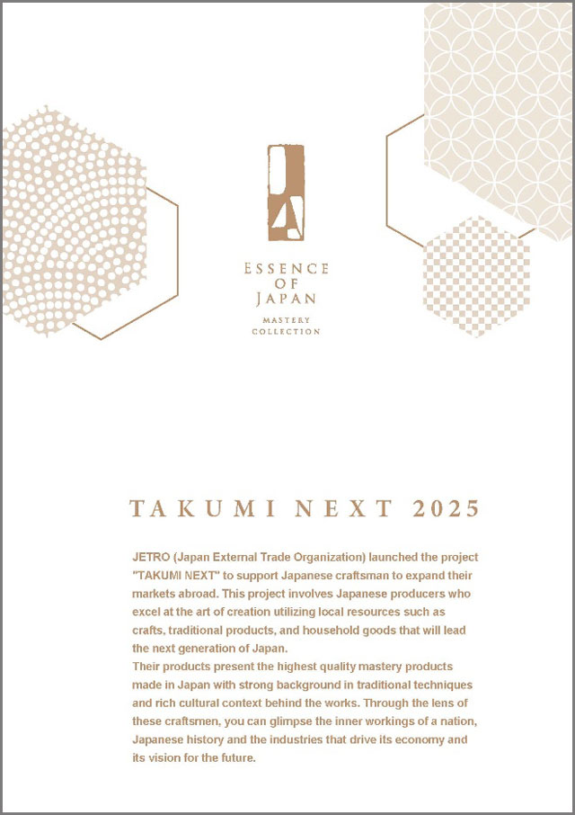 「TAKUMI NEXT」は、2019年度から実施。地域資源を活用した高付加価値商材の海外販路拡大を目指し、日本全国から次世代を担う「匠」企業の海外販売を支援するプログラム。 ジェトロが連携する海外バイヤー(セレクトショップやECプラットフォームなど)とのオンライン商談のほか、インスタグラムでの発信などを通じ、販売、広報での支援を行う。過去のTAKUMI NEXTプログラムを通じて海外展開に成功した事業者へのインタビューはジェトロ活用事例を参照。