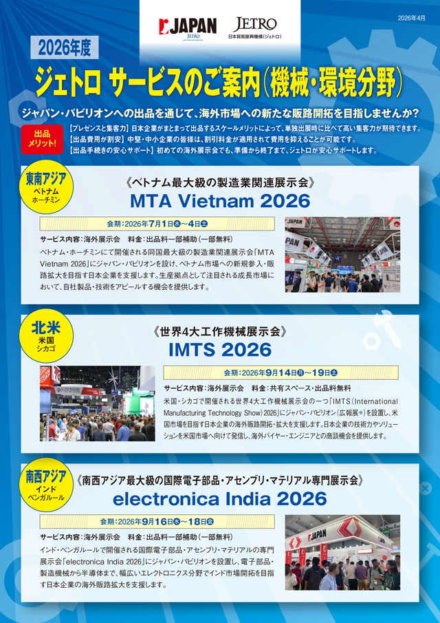 ジェトロが主催・参加する海外見本市・展示会のジャパンブース(ジャパン・パビリオン)へのご出展をサポートします(出展企業・団体を公募します)。