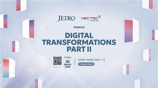 เจโทร กรุงเทพฯ ได้จับมือร่วมกับศูนย์เทคโนโลยีอิเล็กทรอนิกส์และคอมพิวเตอร์แห่งชาติ (NECTEC) หน่วยงานวิจัยชั้นนำของประเทศไทยด้านเทคโนโลยีดิจิทัล เพื่อจัดการสัมมนาออนไลน์ “Webinar on the Topic of Digital Transformation Part II” ภายใต้เป้าหมายในการส่งเสริมความร่วมมือไทย–ญี่ปุ่นด้าน Digital Transformation (DX) วันศุกร์ที่ 20 มีนาคม 2569 เวลา 14.00-15.05