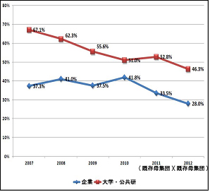 - 企業と大学公共(研究所)の知的財産担当組織保有比率は増加