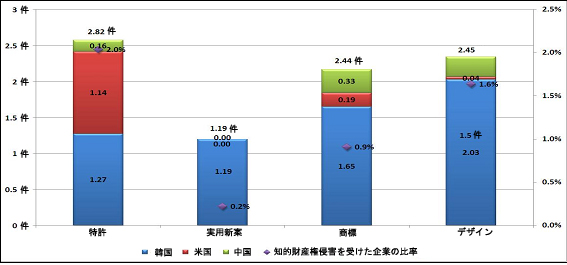 - '11年に特許権侵害を受けた企業は、2.0%(3.3%)であり、平均侵害件数は、2.82件(2.22件)
