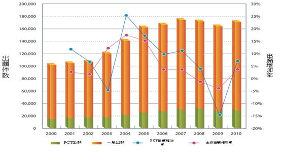 韓国の全体特許出願件数の年度別の状況、韓国特許動向2000~2012 p.9を引用
