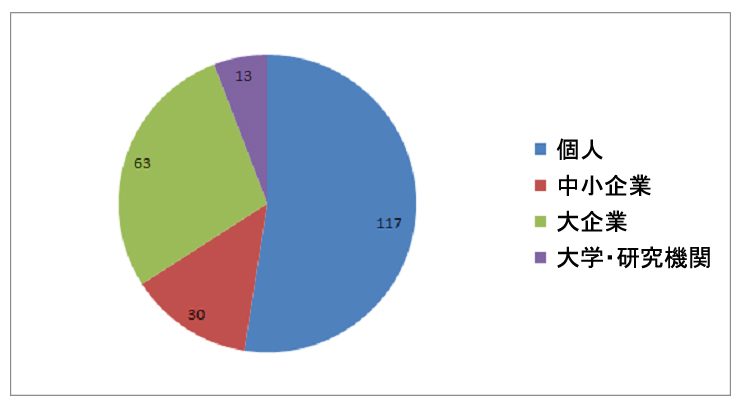 ※タッチジェスチャーを使った文字入力方式の内国人のうち、個人の割合は52.5%(117件、ここ6年間)であり、全体特許出願の内国人のうち、個人の割合は24.8%(2011年)