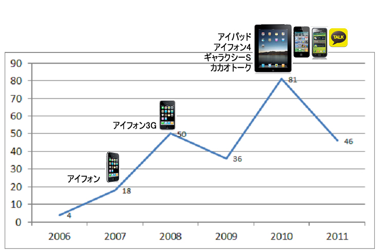 韓国特許庁によると、タッチジェスチャーを使った文字入力方式の特許出願は、2006には4件だったのが徐々に増加して2008年50件、2009年36件、2010年81件、2011年46件に達している。アイフォン3Gが登場した2008年と、ギャラクシーS、アイパッド、カカオトークが登場した2010年に出願件数が急増した(参考資料1)。