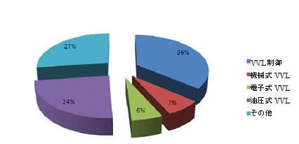 VVL装置は、バルブの開く量を調節する方式により大きく機械式、電子式および油圧式の3種類に区分されるが、このうち現在多くの市販車に適用されている油圧式VVLに関する出願が最も多かった。技術分野別では、VVL装置の制御に関する発明が全体出願の36%と最も大きい割合を占めているが、これは最新の自動車技術が大部分電子制御方式を利用しているのを反映していると見られる。