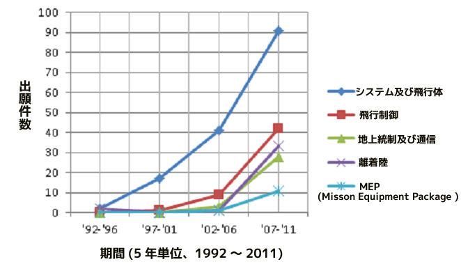 過去5年(2002~2006)と最近5年(2007~2011)間の出願動向を技術分野別に比較すると、無人航空機のシステム及び飛行体技術が41件から91件、飛行制御コンピュータ技術は9件から42件に増加し、地上統制及び通信設備技術が3件から28件、そして離着陸技術は1件から33件に、MEP(Misson Equipment Package )技術は1件から11件に大幅増加している。特に、飛行制御技術、地上統制及び通信技術、離着陸技術、MEP技術などの特許出願が大幅増加し、航空技術と情報通信技術が結合された代表的な融合技術である無人航空機技術分野で情報通信技術が占める割合が高まっていると分析されている。