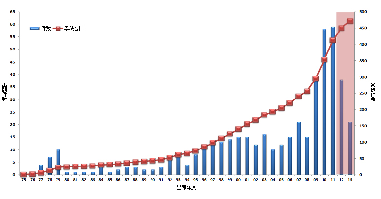 参考1:年度別における世界のリチウム抽出技術の出願現状(1975~2013)