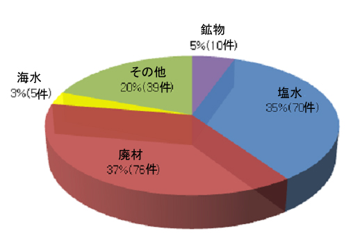 リチウム抽出方法としては、塩水からの抽出法が70件で鉱山(10件)や海水(5件)より多い。塩水からの抽出技術のなかでは、リチウムを直接抽出する技術が41%(29件)で最も多く、不純物の精製26%(18件)、その他リチウム化合物の製造14%(10件)、蒸発濃縮12%(8件)、炭酸リチウム製造7%(5件)の順となっている。