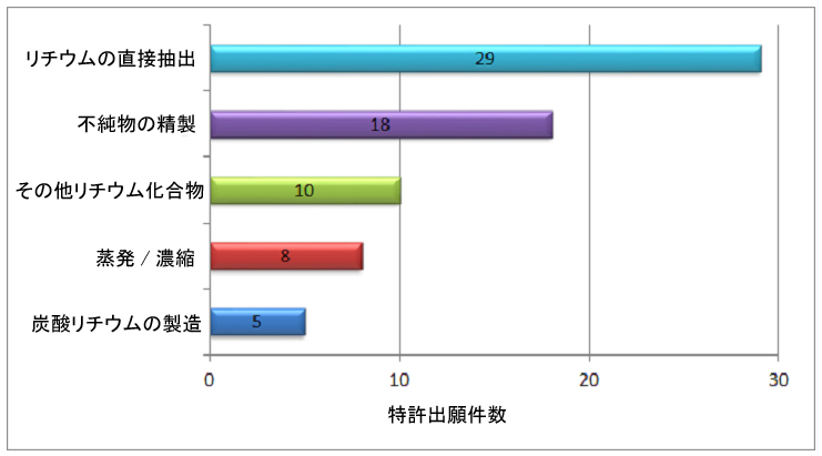 韓国特許庁が主要5カ国のリチウム抽出関連の特許を分析した結果によると、1975年に初めて特許出願が行われ、1990年代から出願が増加し始め、2009年39件、2010年58件、2011年59件と、最近になって出願が急増したとえいる。