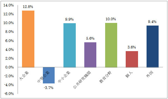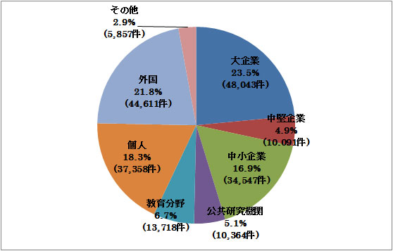 出願の伸び率も大企業が12.8%と最も高かった。教育分野は10.0%で2番目となったが、出願全体で占める割合は個人や外国人などに比べて低いものの、出願の伸び率では成果を上げていることが分かる。