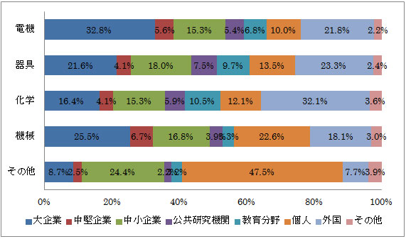 技術分野別の特許出願は、電機および機械分野は大企業が、器具および化学分野は外国が最多出願となった。特に電機、化学、その他の場合は、大企業が前年比それぞれ15.0%、17.1%、24.6%と著しい伸び率を見せた。機械の場合、公共研究機関が19.1%、器具の場合は大企業と公共研究機関がいずれも8.5%で最も高い伸び率となった。