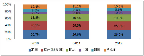 2012年ベースの国別の存続特許※件数のうち、米国の存続特許の割合が26.2%と最も多く、次いで欧州諸国(38カ国)が25.0%だった。中国と日本は存続特許の割合が2010年それぞれ7.5%、18.8%から2012年10.2%、19.8%と持続的に増加しており、韓国は8%の水準を維持し、2012年ベースで5番目に存続特許の多い国となった。