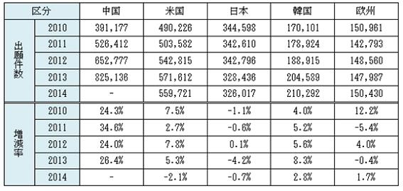 '08年~'10年のグローバル金融危機以降、景気の回復を受けて特許出願も'11年~'13年まで急増し、'14年も増加勢は多少鈍化したものの、4年連続の増加となった。