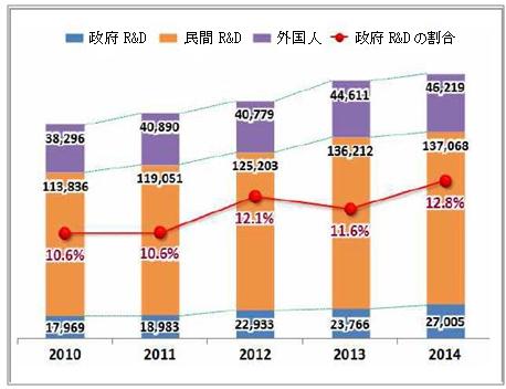 特許庁によると、政府R&D事業により創出された国内特許出願は2014年27,005件と、国内特許出願全体(210,228件)の12.8%(2010年10.6%)を占めた。過去5年間の年平均約10.7%ずつ増加して特許出願全体の増加率の2倍となり、特許生産性※も1.53と、米国及び日本に比べ非常に高かった。