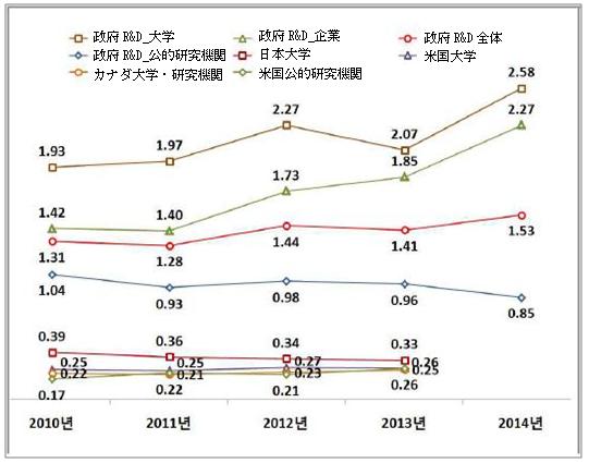 政府R&Dと海外主要研究機関の特許生産性比較