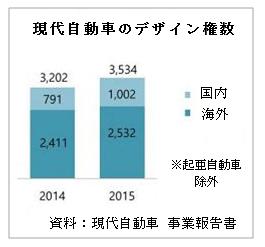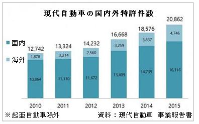現代自動車の事業報告書によると、現代車は2015年12月時点で国内1万6,116件、海外4,746件等、計2万862件の特許を保有している。前年に比べ国内特許は1,377件、海外909件増え、それぞれ9.3%と23.7%の増加率となった。