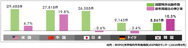2020年上半期のPCTによる国際特許出願件数の増加率、世界2位