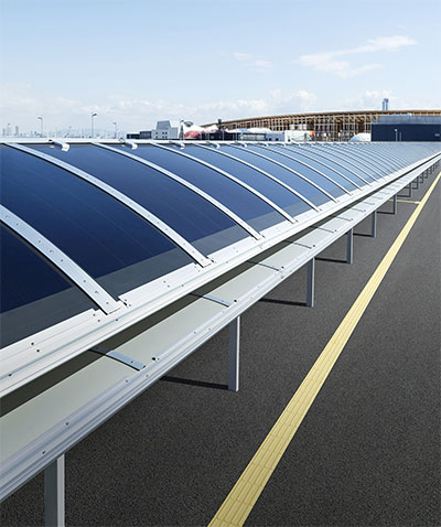 バスで万博会場に向かう来場者を迎えるのが、西ゲート交通ターミナルのバス停屋根に設置された世界最大規模、250メートルにおよぶフィルム型ペロブスカイト太陽電池だ注5 。10年以上の研究開発を経て、積水ソーラーフィルムが製品化したこの太陽電池の厚さはわずか1ミリメートル。従来のシリコン太陽電池の約20分の1の薄さだ。「薄くて、軽くて、曲がる」という特長を生かし、シリコン太陽電池では設置が難しかった耐荷重が小さい構造物やカーブ状の壁面など、さまざまな場所に設置ができる。万博会場のバス停屋根もカーブ状。ペロブスカイト太陽電池の強みを大いに発揮している。屋根で発電した電力は蓄電池に貯められ、バスターミナル全体の夜のLED照明用に供給されている。