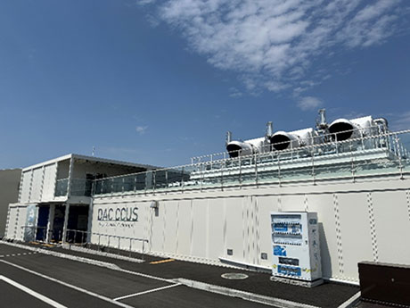 RITE未来の森のDAC装置には、RITEが開発した「RITEアミン」という化学品を用いる。アミンは、温度が低い環境でCO2を吸収しやすく、温度が上がるとCO2を離すという性質を持つ。大気中から吸入された空気は、RITEアミンを染み込ませた微粉状のCO2吸着剤を塗布したハニカム状基材を通り、CO2は基材内に吸収、それ以外の空気は反対側から排出される。一定量の吸収が終わると、装置を密閉し温度を上げて真空ポンプでCO2を取り出す。取り出されたCO2は蒸気との混合ガスの状態のため、冷やして水とCO2に分離し、回収する仕組みだ。RITE2025年大阪・関西万博室によると、2025年1月の試運転開始から現時点までの実験結果は「想定よりもかなり良好」だという。気温や湿度の上昇はアミンのCO2吸収量に影響するため、梅雨や夏に向けて影響度合いを調べていく計画だ。アミンなどの材料も空気と触れることによる酸化などで劣化していくため、耐久性の実証も重ね、社会実装を目指す。