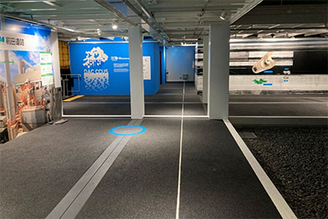 「RITE未来の森」ではCO2を回収する技術だけでなく、回収したCO2を貯留・活用する技術も見学できる。パビリオン内部に敷かれたアスファルト舗装もその1つ。道路整備や建材資機材の製造販売などを手掛ける前田道路が取り組む「CO2を固定化したアスファルト舗装」だ。来場者は実際に舗装された道を歩くことができる。